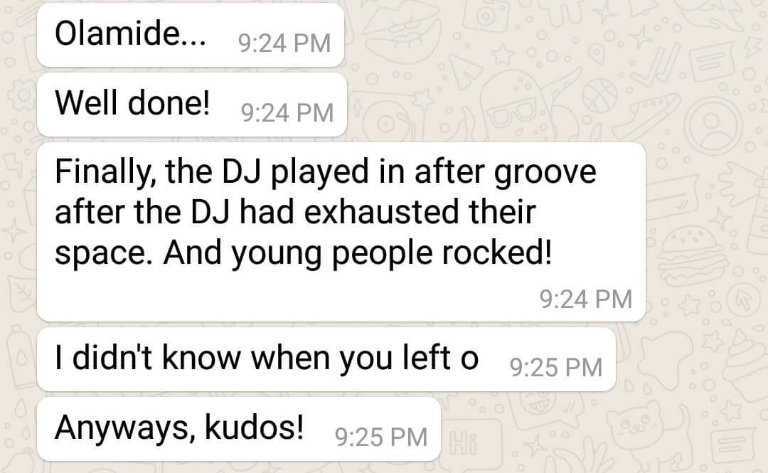 – The Lagos Marathon was on the wedding day and most roads were blocked causing traffic everywhere. The limo couldn’t get to the hotel venue in time to take the bride and her friends to the church, we had to get an alternative car to get them to the church and also assured them that the limo would be at the church venue waiting to bring them to the reception. Also we had to keep calling the limo driver to communicate the roads that were free.